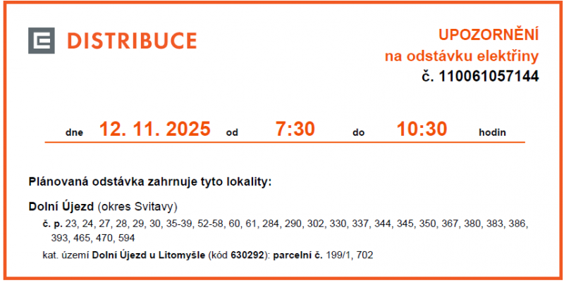 VE STŘEDU 12.11. BUDE VÝDEJNA LÉKŮ V DOLNÍM ÚJEZDĚ Z DŮVODU ODSTÁVKY ELEKTRICKÉ ENERGIE ZAVŘENA.