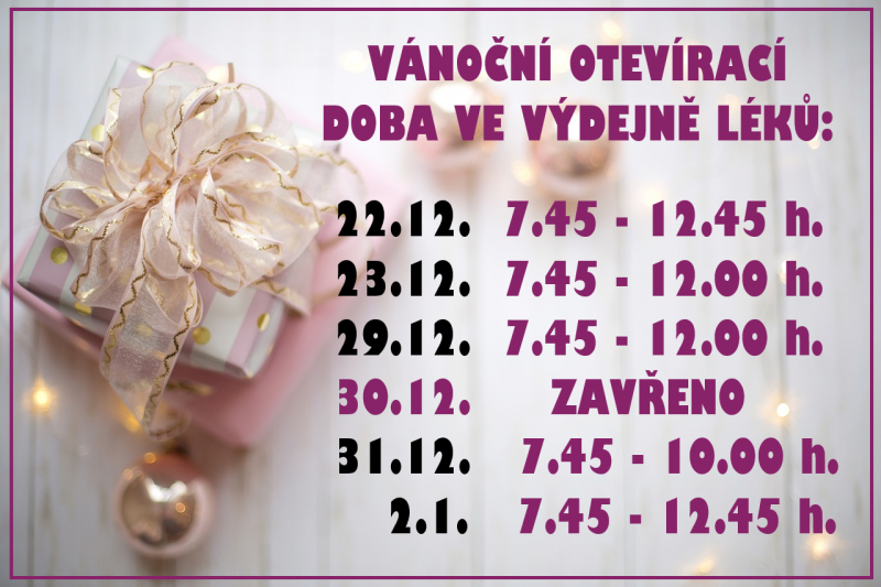 Ve dnech 23.12.,31.12.2025 a 2.1.2026 bude ordinace v době 7.30-10 hod.